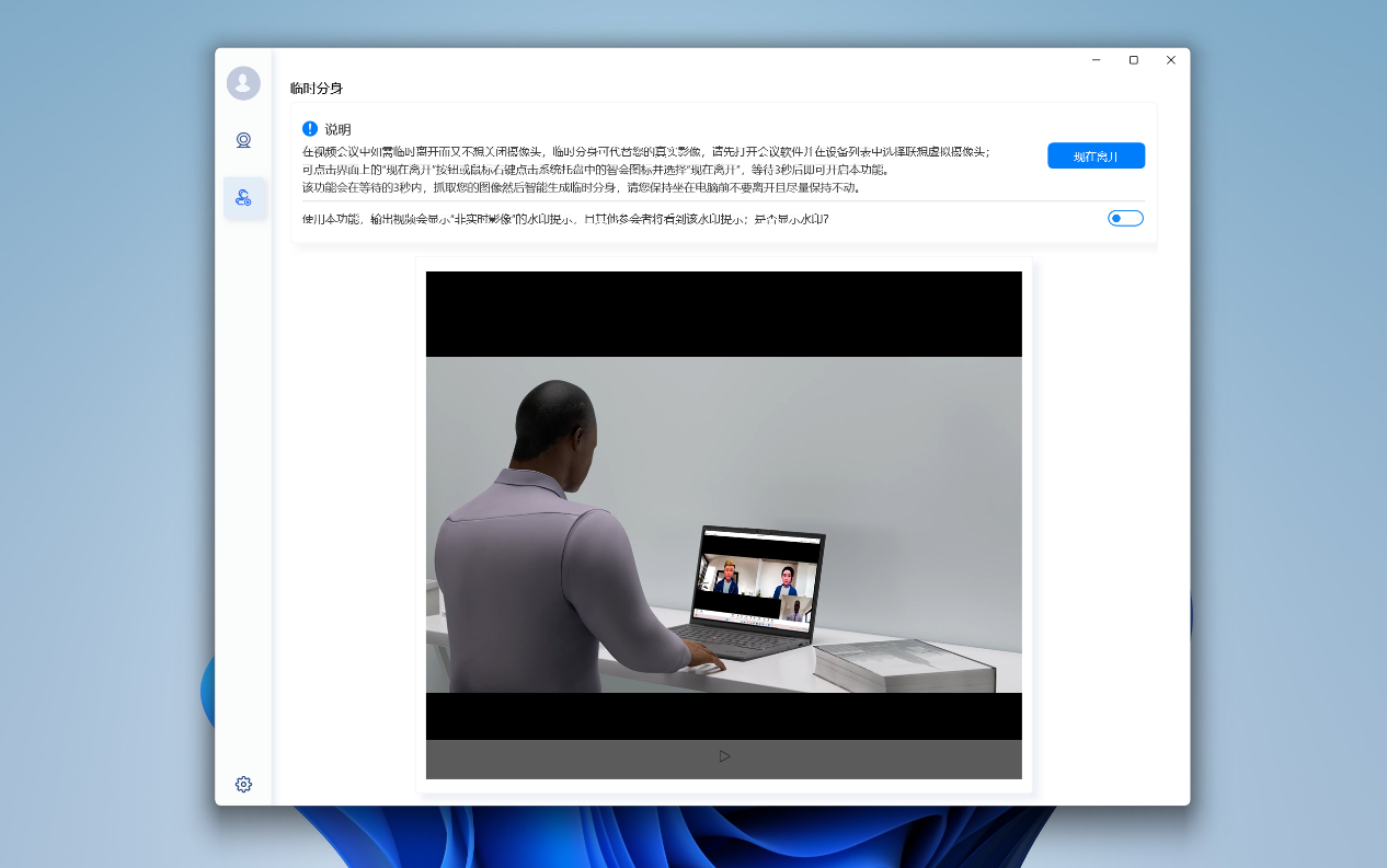 最厉害的要数这个临时分身功能,它可以录制一个你的虚拟形象,当会议中你需要临时离开的时候,打开它你的虚拟形象就会代替你“开会”,足够以假乱真,开启后屏幕右下角会弹出临时分身的状态提示框,直到你回到电脑前,这个功能有多厉害相信不用我过多解释了。