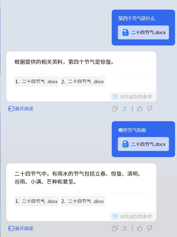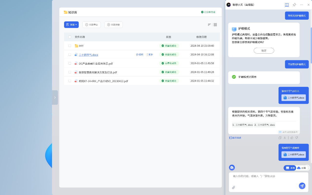这里我问了联想小天 2 个关于文档《二十四节气》的问题,它都能帮我们快速检索文档,提取信息和总结归纳出来,非常省心,而且体验是非常个性和私人的,理论上你喂的文档越多,类型和领域越专一,联想小天也会越用越顺手。