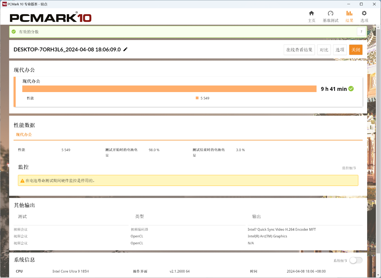 最下方还有一块 84W 的大电池,在 PC Mark 10 的现代办公续航基准测试中,我们打开机器的智能省电模式,以 60% 的屏幕亮度(约 250nit)进行测试,实测续航成绩达到了 9 小时 41 分,表现还不错。如果进一步切换到集显模式,相信还会有更好的续航表现。