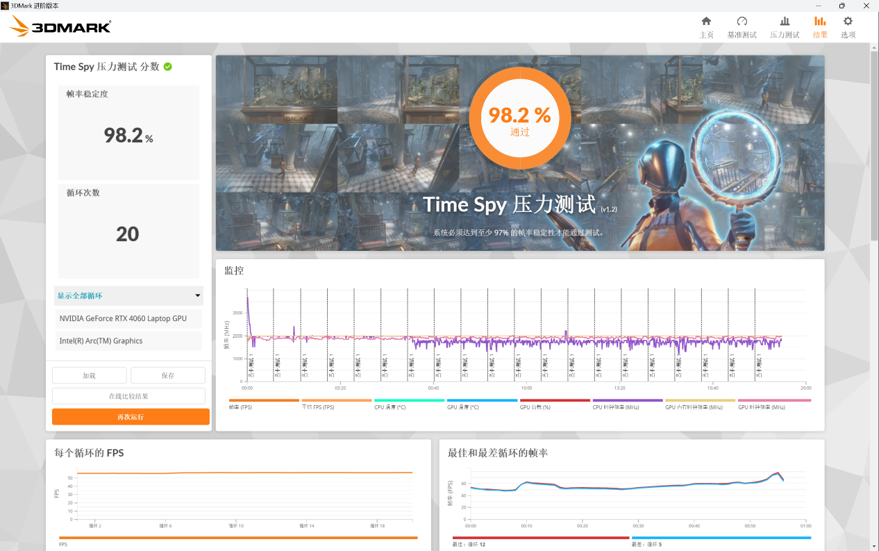 甚至连为游戏本准备的 Time Spy 压力测试我们都出于好奇进行了测试,最终昭阳 X7 AI 高能本以 98.2% 的稳定度成绩顺利通过测试,足以说明其出色稳定的性能释放表现。