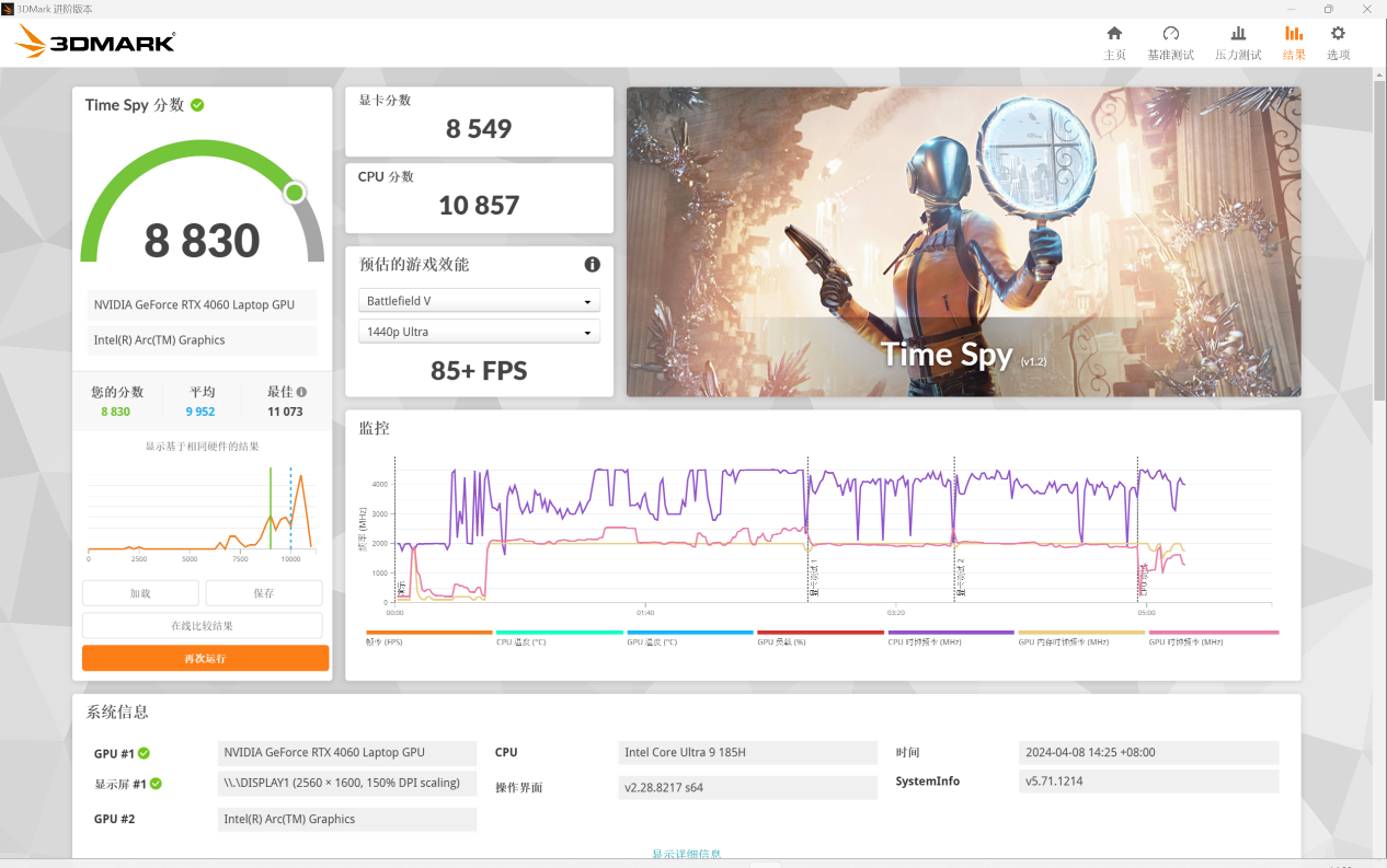 GPU 方面,RTX 4060 这颗独显相信大家都非常熟悉了,我们直接看测试。在 3D Mark Time Spy(DX12 游戏)测试项目中,昭阳 X7 的显卡分数达到了 8549 分。