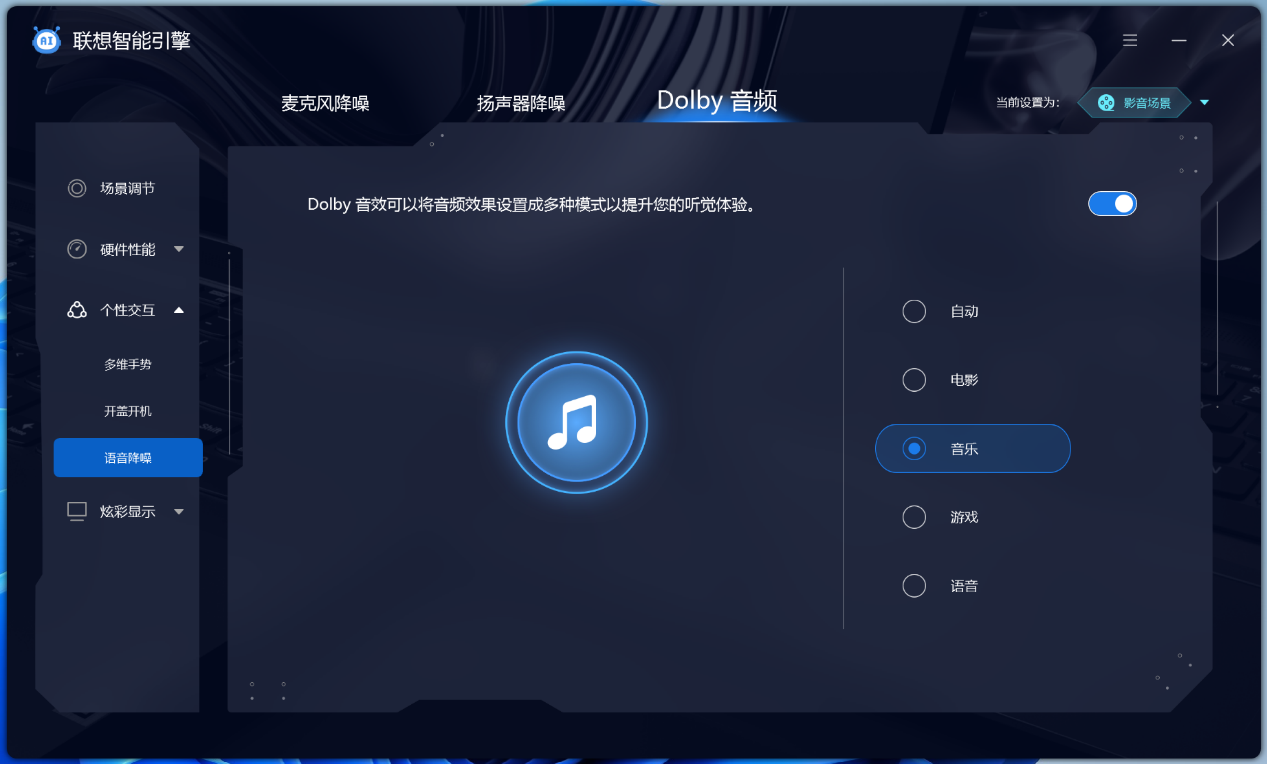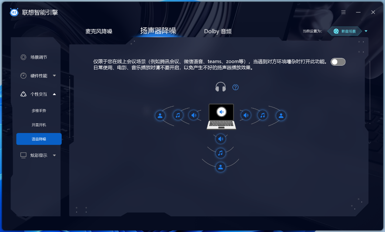 不过它最实用的地方还是 AI 智能场景调节,它可以根据使用电脑的应用和功能场景,自动切换场景预设,开启或优化相关功能。比如会议场景中,它会自动打开麦克风降噪和杜比音效的语音模式;影音场景中,杜比音效随之切换到音乐模式,麦克风降噪关闭,并启用触控板手势防止误触等等。也就是说上面提到的小功能,都会被智能引擎打包成一个场景预设方案连携执行,非常适合懒人。