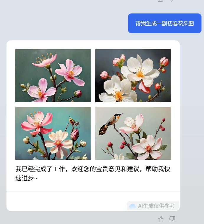 再有就是云端模式了,它对应的是辅助创作部分。你可以让它出一个工作周报模板,旅行计划,或者创作一幅 AI 图片,从而更好的激发创作灵感或者提升创作效率。点击输入框右上角切换到云端模式,然后我们让联想小天帮忙创作一幅“初春花朵图“,小天很快生成了四张 AI 图片,效果都非常不错。