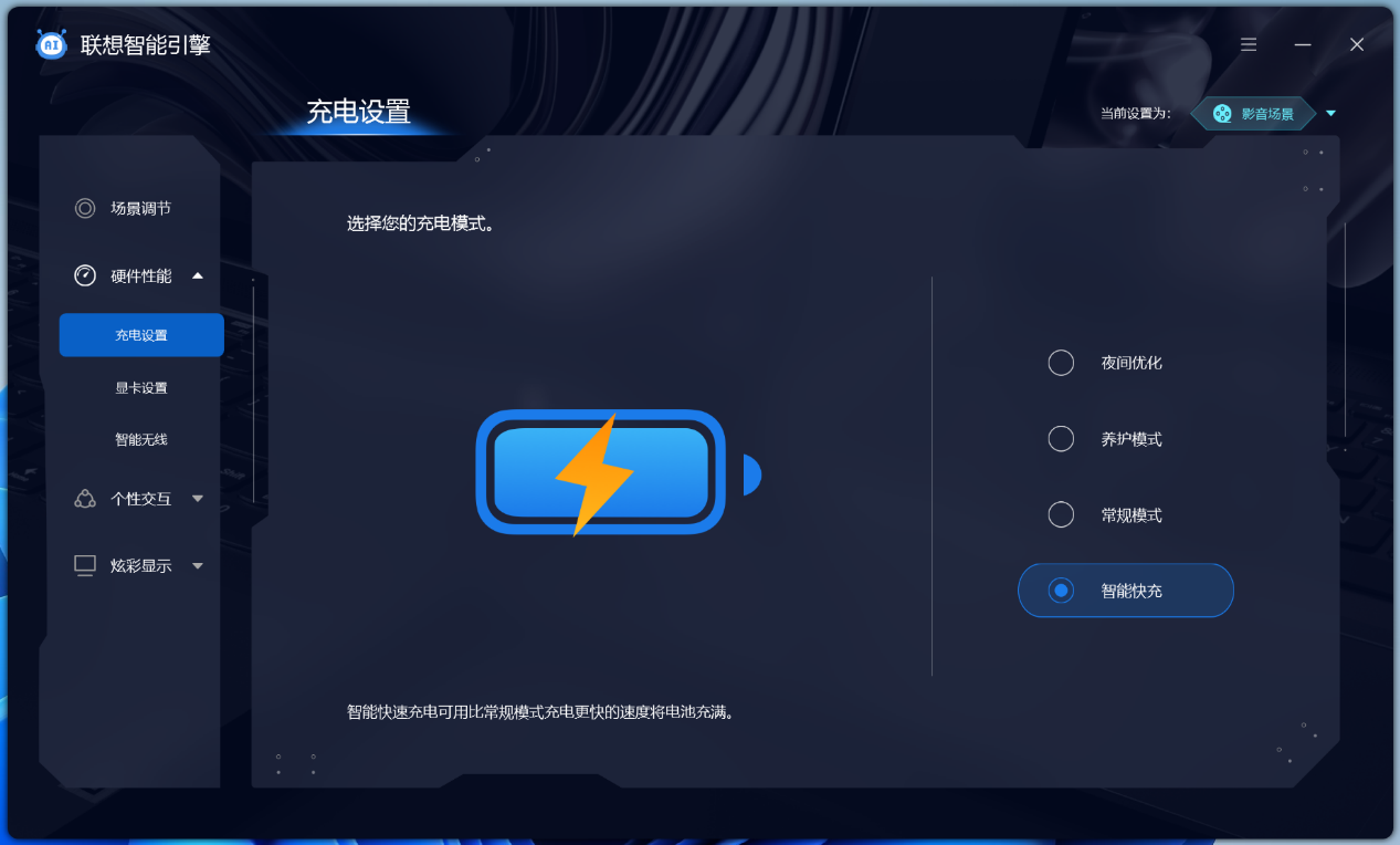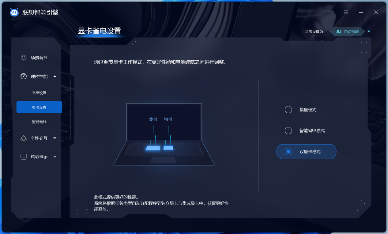 联想智能引擎算是一个类似控制中心的应用,里面可以进行显卡模式切换,杜比音效调节,麦克风 / 扬声器降噪、电池快充以及网络优化等功能。