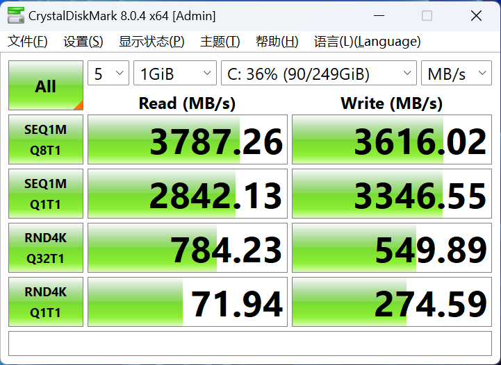 在左右风扇的下方,各有一个标准 2280 尺寸的 M.2 硬盘位,中间是英特尔最新的 AX211 无线网卡,机器自带了一条来自忆联,型号为 AM6A1 的 1TB 容量固态,实际读写速度如图所示。