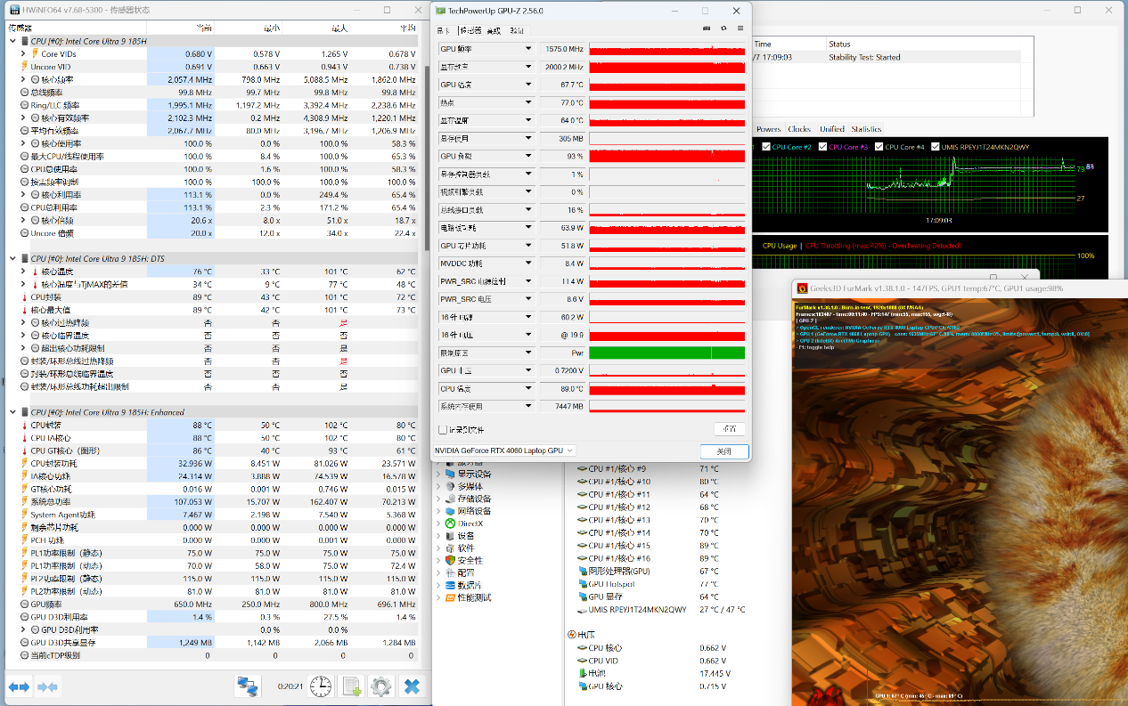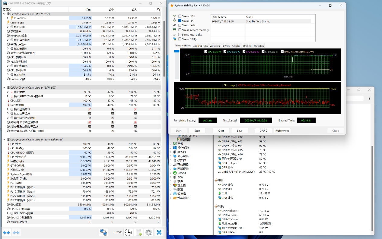首先是单烤 FPU,10 分钟之后 CPU 功耗保持在 70W,此时 CPU 的 P 核频率位 3.1GHz,CPU 温度为 93°,这个功耗表现相比前几代昭阳产品提升还是很明显的。还记得去年我们测过的那台昭阳 X7 虽然用上了 13 代 i7-13700H 标压处理器,但是单烤功耗只有 55W,温度同样是 90° 以上,所以理论上这次的 Ultra 9 185H 处理器能够带来更好的性能表现。