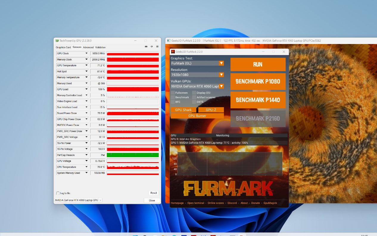 最后是压力更大的双烤环节,这次直接双烤 20 分钟,最初 CPU 功耗来到了 54W,核心温度直接突破 100°,随后逐渐下降并稳定在了 32W 左右,CPU 温度也回落到 88°。GPU 这边的功耗则稳定在 63W 左右,温度倒是不高,只有 67°。这样算起来整机性能释放就是 95W,作为商用本已经是超出预期的水平了。