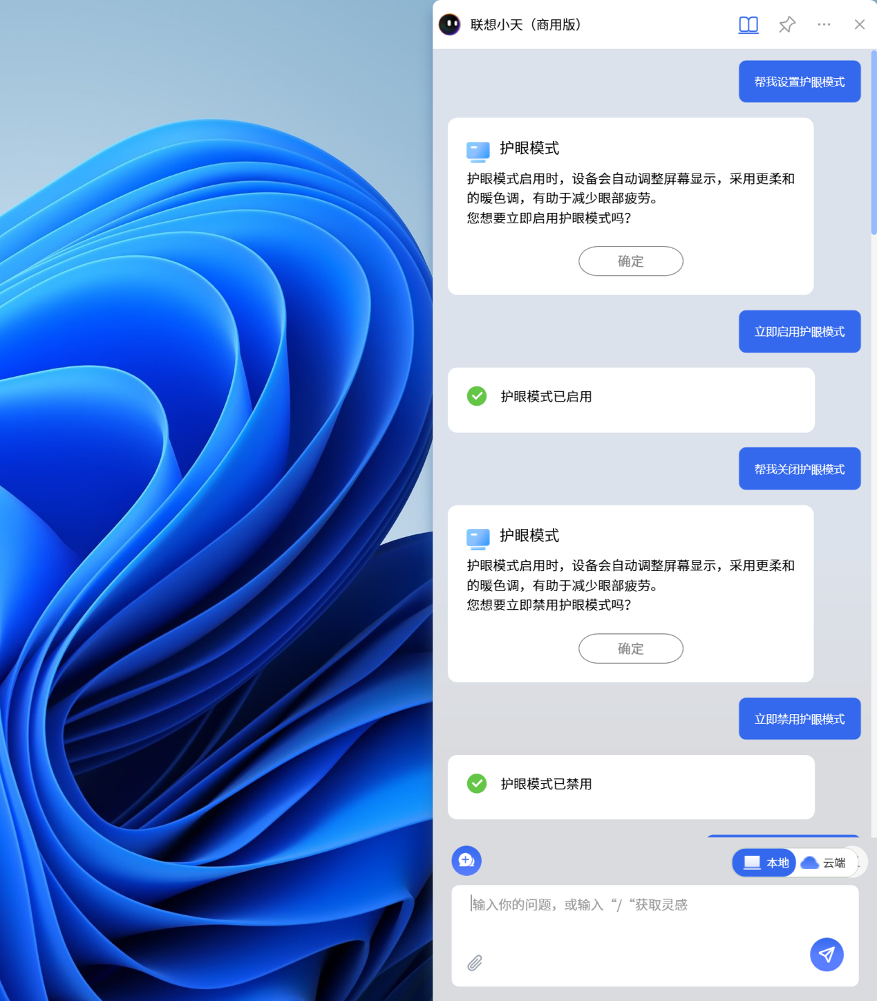 设备管理很好理解,在本地模式中你可以让小天帮你进行一些功能设置,比如设置高性能模式、快充模式、护眼模式等。拿护眼模式举例,我们在下方文本框内输入“帮我设置护眼模式”几个字,联想小天会弹出一条提示气泡,问我们是否要开启功能,以防理解错误。这时候点击确定,小天就会自动帮我们生成文字指令,随即开启功能,并弹出一条已启动护眼模式的状态信息。反过来关掉护眼模式也是一样的操作。