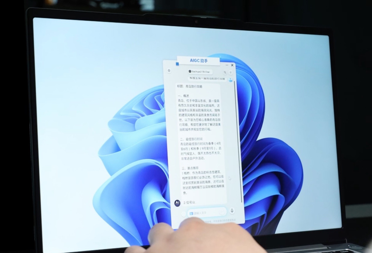 我们还测试了一些第三方的 AI 应用,例如英特尔推出的 AIGC 助手演示版,这款应用需要有英特尔酷睿 Ultra 处理器或者英特尔 Arc 系列显卡的硬件支持,它内置了高达 200 亿参数的语言达模型库,你可以和它聊天,找它解题,让它翻译一篇文章,或者帮你制定一份旅行计划,所有的操作都在本地运行,无需联网。昭阳 X7 AI 高能本能够完美运行该软件,让你的工作和创作更有效率。