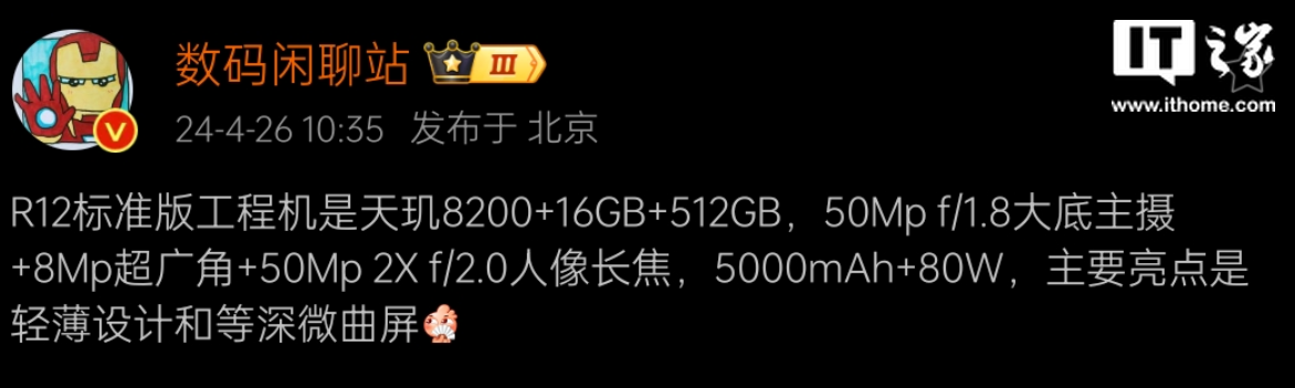 IT之家 4 月 26 日消息,博主 @数码闲聊站 今日曝光了一款 OPPO 标准款新机的主要配置,预计为 Reno12 系列。