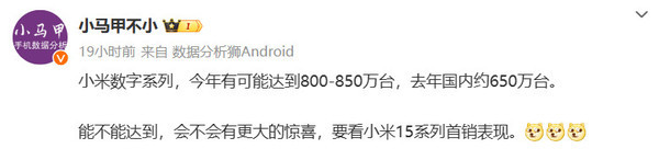 不过,该博主还表示,能不能达到、会不会有更大的惊喜,还要看小米15系列的首销表现。也就是说,单凭小米14系列等现在的数字系列旗舰机,还很难达到800万-850万的高度,因此小米15就显得尤为关键了。