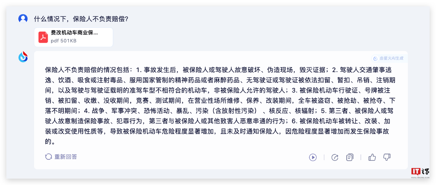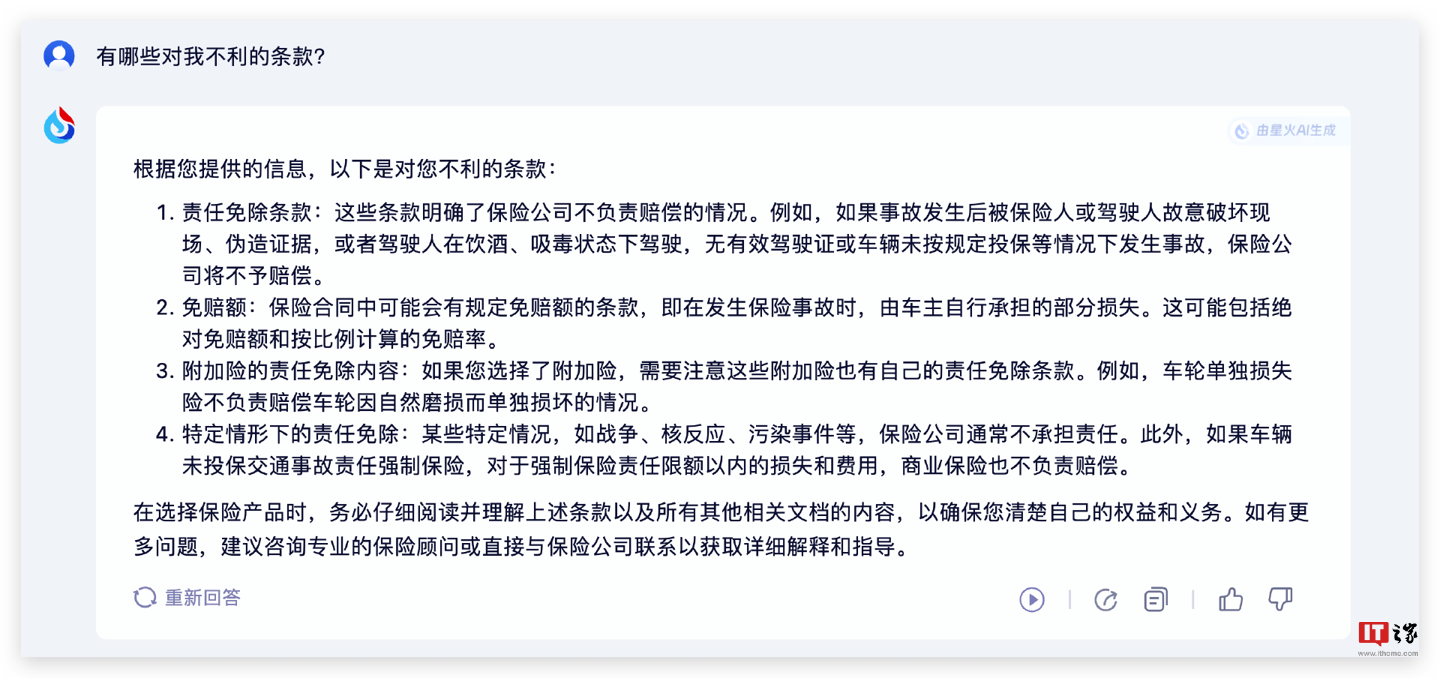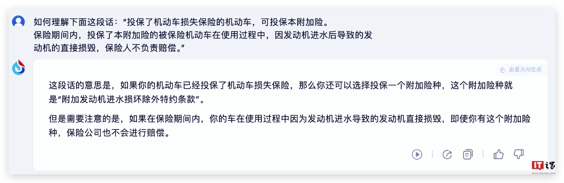 但是,这里有个“发动机涉水是包含在车损险保障范围内”的前提,而这个前提并未出现在这份两万字的“免责事项说明书”中。讯飞星火大模型 V3.5 是通过笔者提供的长文本来检索,自然也不知道这一点。
