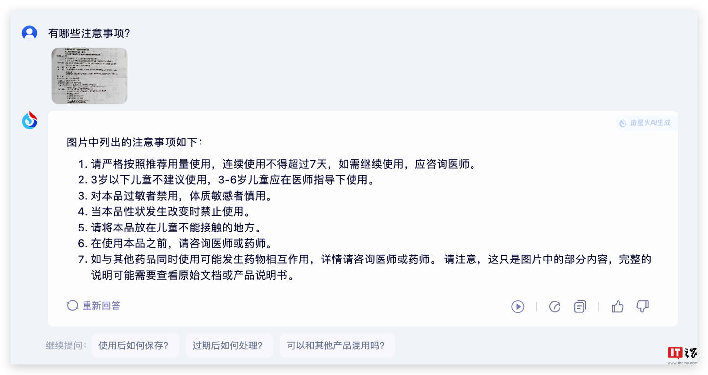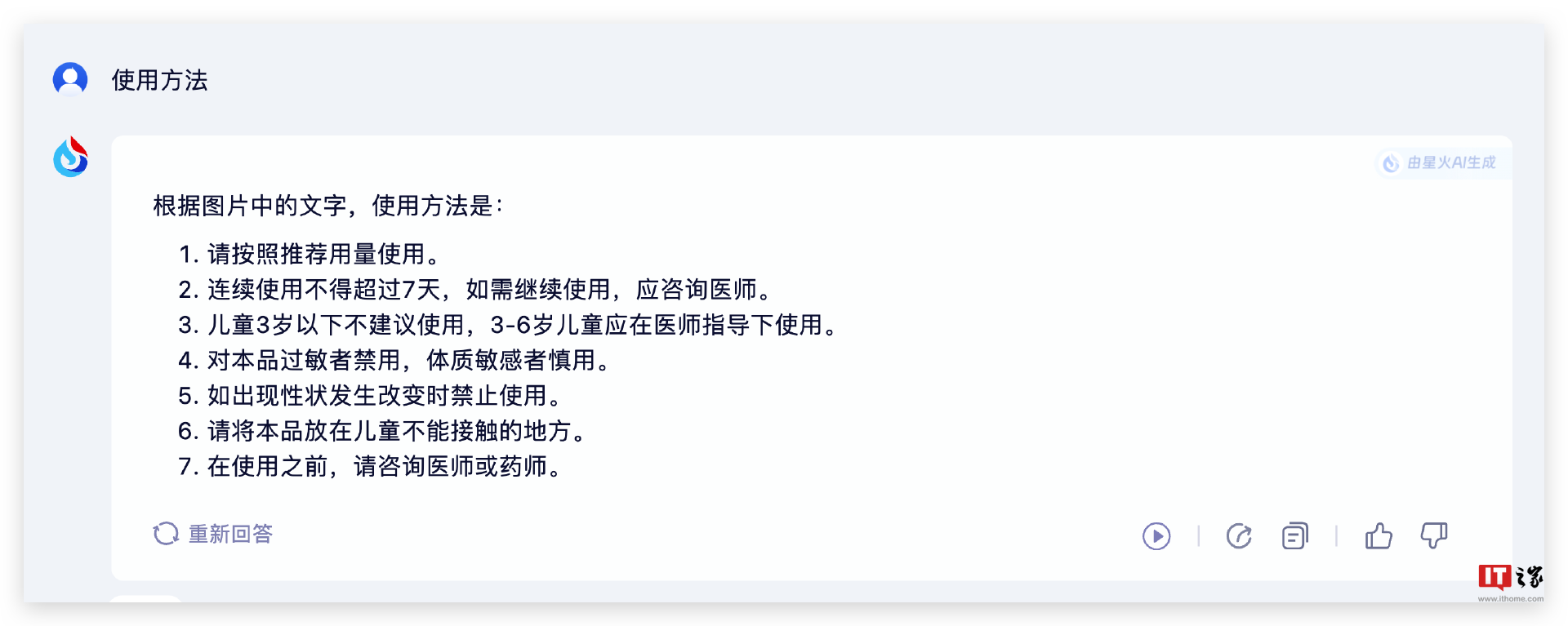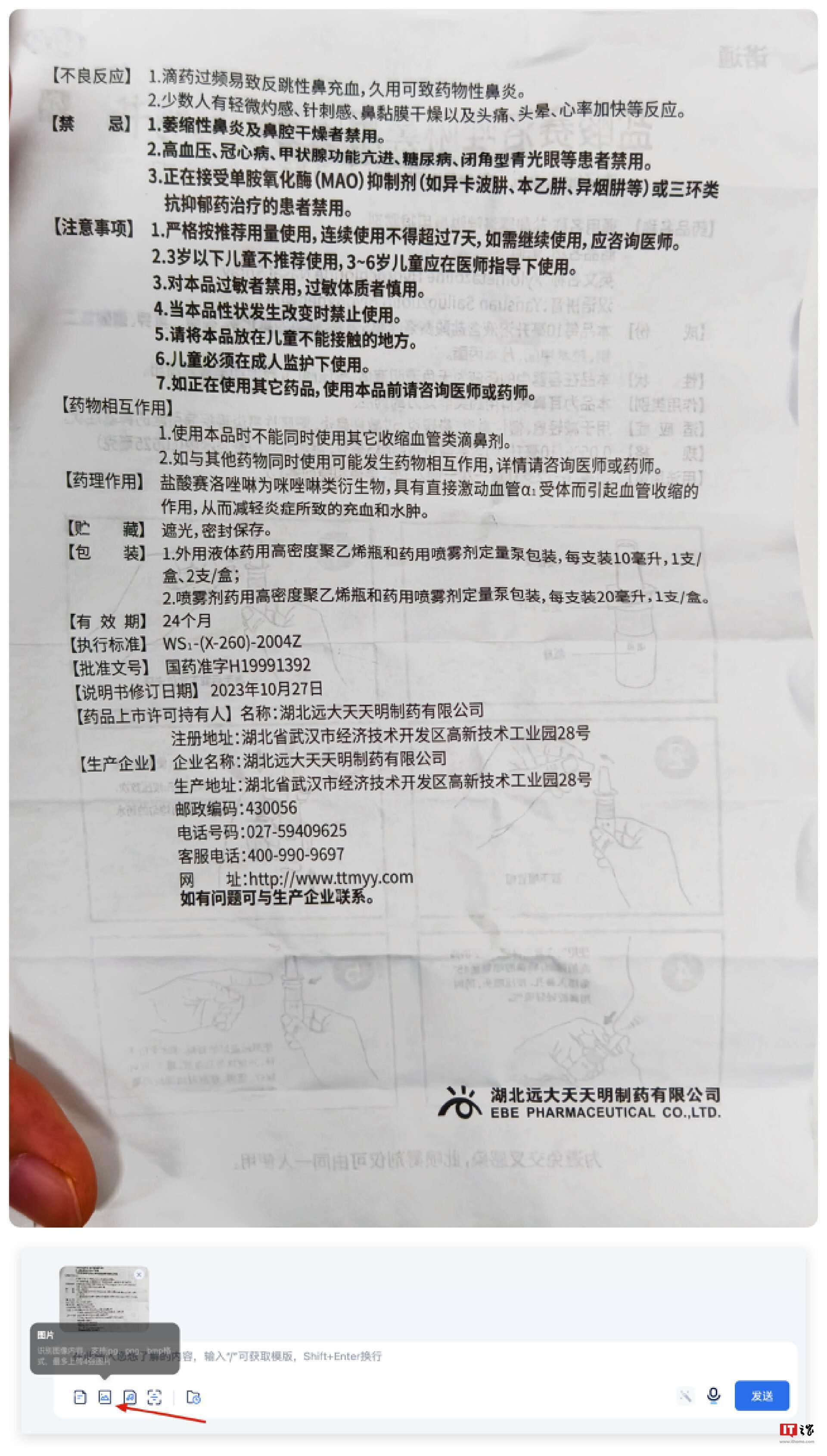 以笔者刚刚买的“鼻用喷雾剂”举例,手机拍摄说明书照片,随后上传至讯飞星火 V3.5 中。