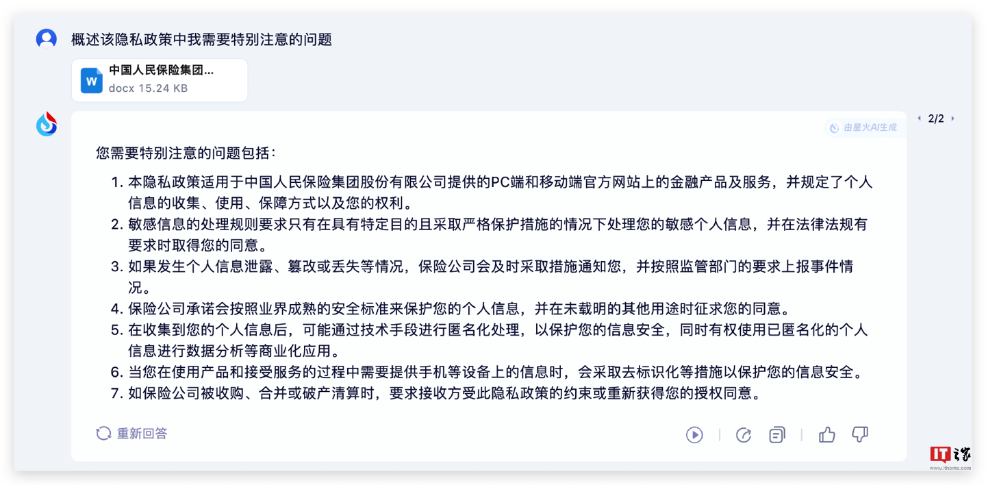 笔者将该隐私政策复制成 Word,随后上传至讯飞星火大模型 V3.5 聊天框中: