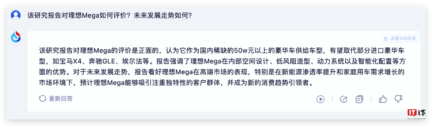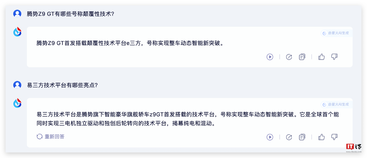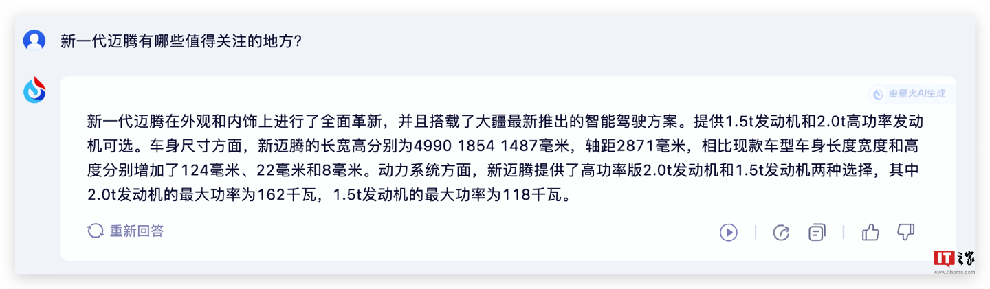 接下来笔者又围绕腾势、迈腾等新车,提出了更具体的问题,讯飞星火 V3.5 的答复都很令人满意。