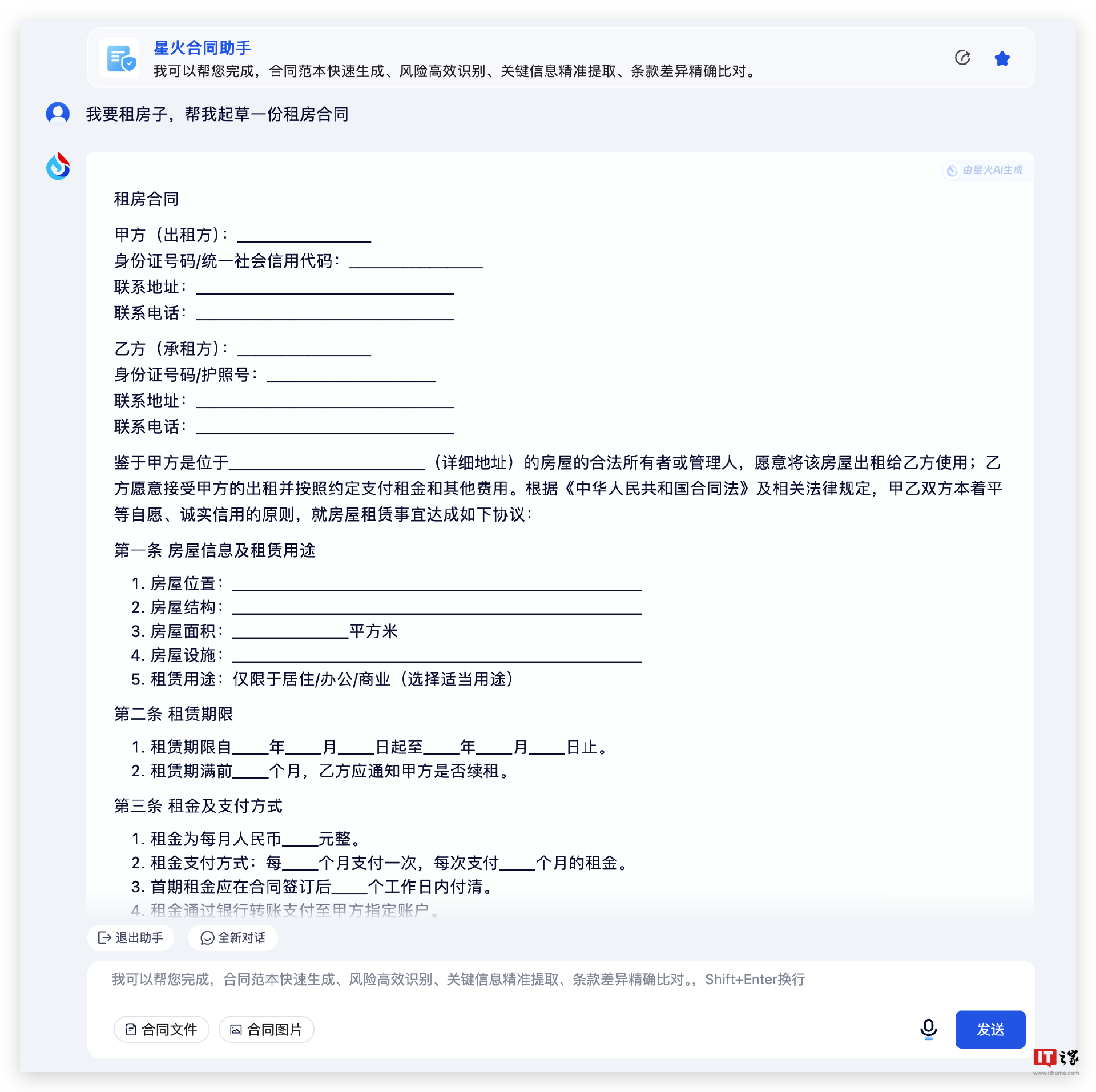 首先,讯飞星火大模型 V3.5 全新引入了新引入的“星火合同助手”小组件,能全面辅助用户快速起草各类合同。