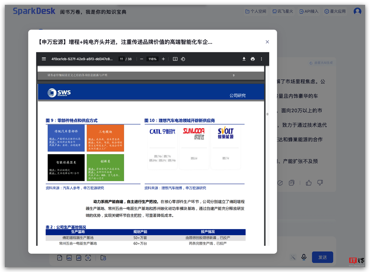 关于理想汽车的一份研究报告,有大量的图表、图片说明和数据,讯飞星火 V3.5 甚至还能根据报告中非常细分化的问题(比如销量)做出回答。