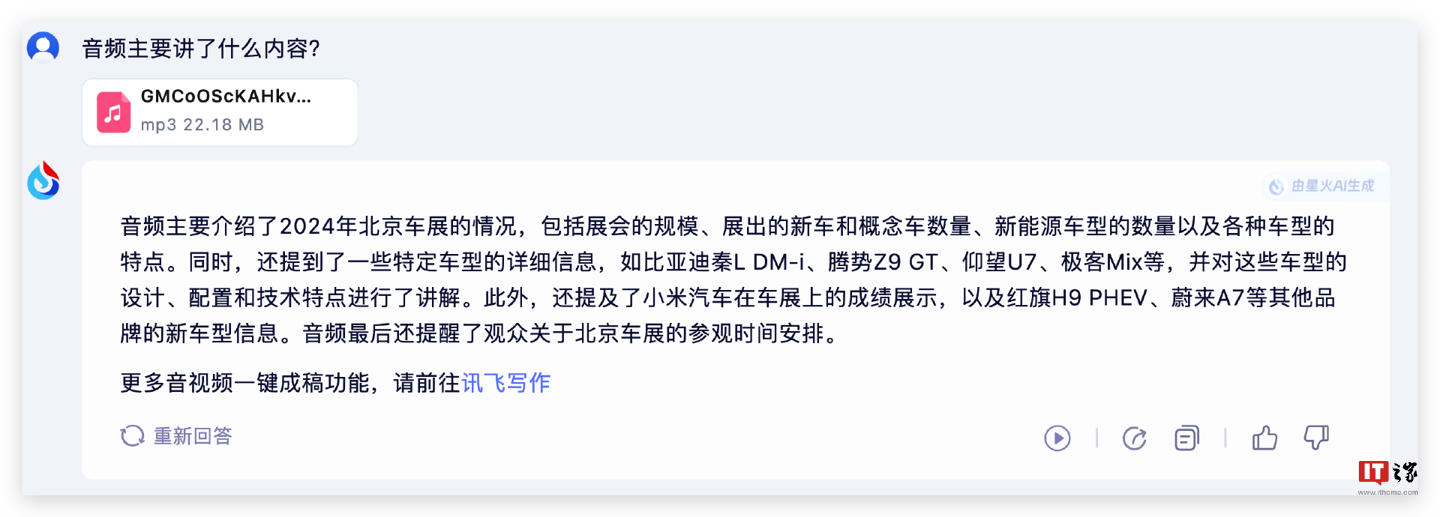 针对音频,笔者提问了音频的主要内容,讯飞星火 V3.5 用极短的时间给出了回答。