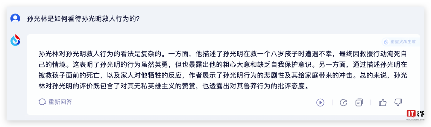 比如,在“看待孙光明救人行为”这一问题时,讯飞星火 V3.5 回答“对其无私英雄主义的赞赏,也透露出对其鲁莽行为的批评态度。”