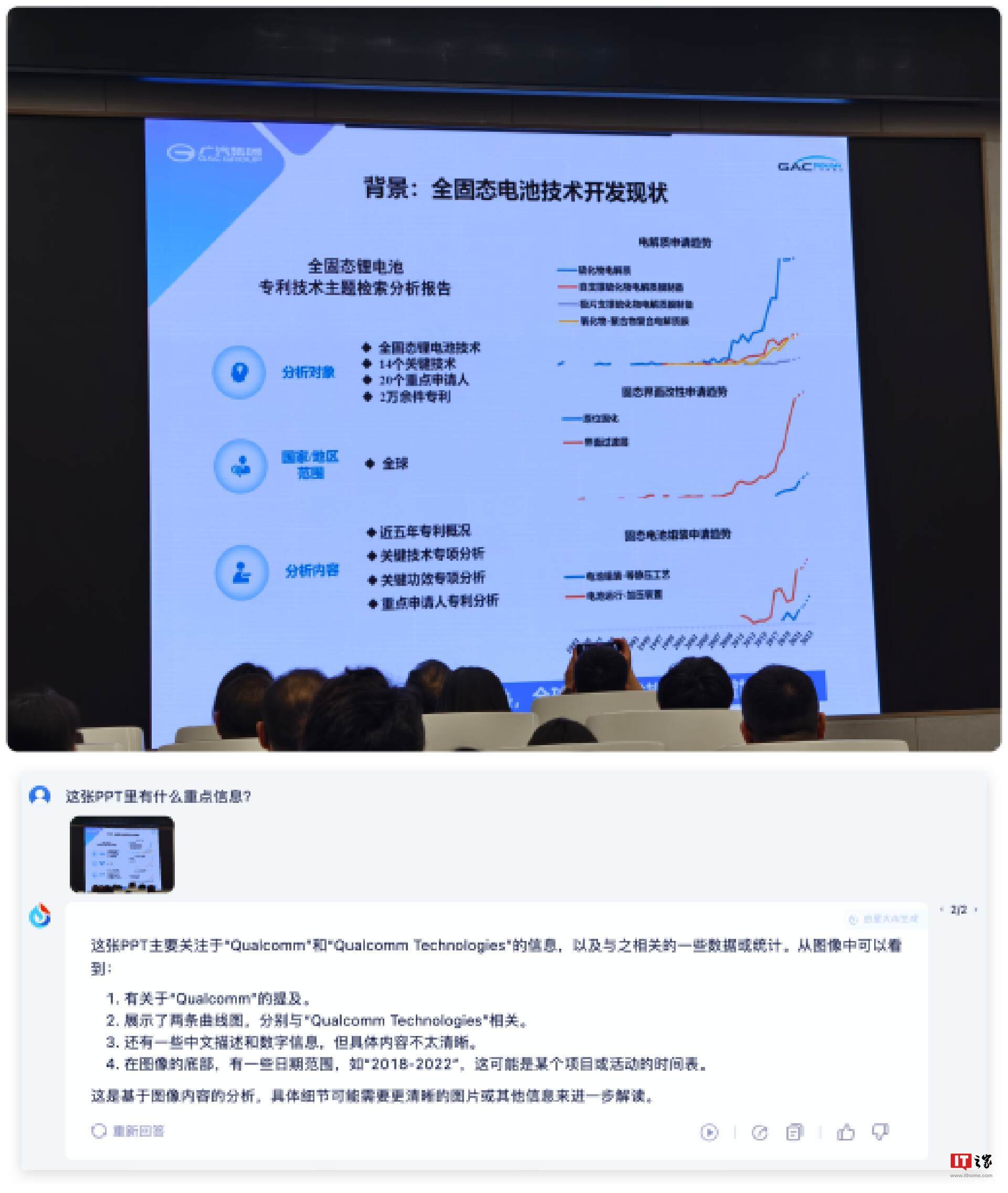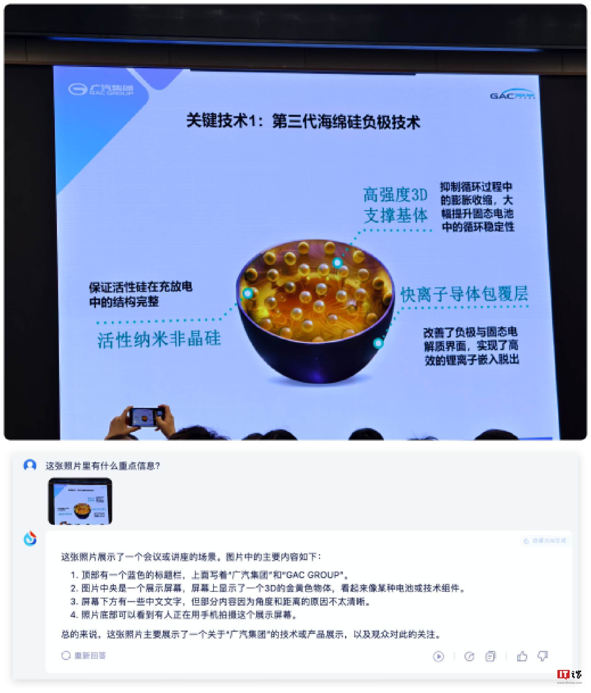 结果显示,讯飞星火 V3.5 准确地识别出了照片中的内容,并且正确判断出这是广汽集团的技术展示,同时注意到了在场观众对此表现出的高度关注。