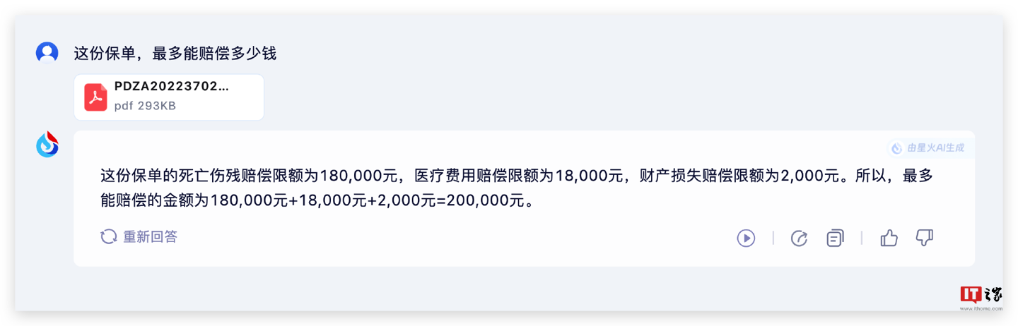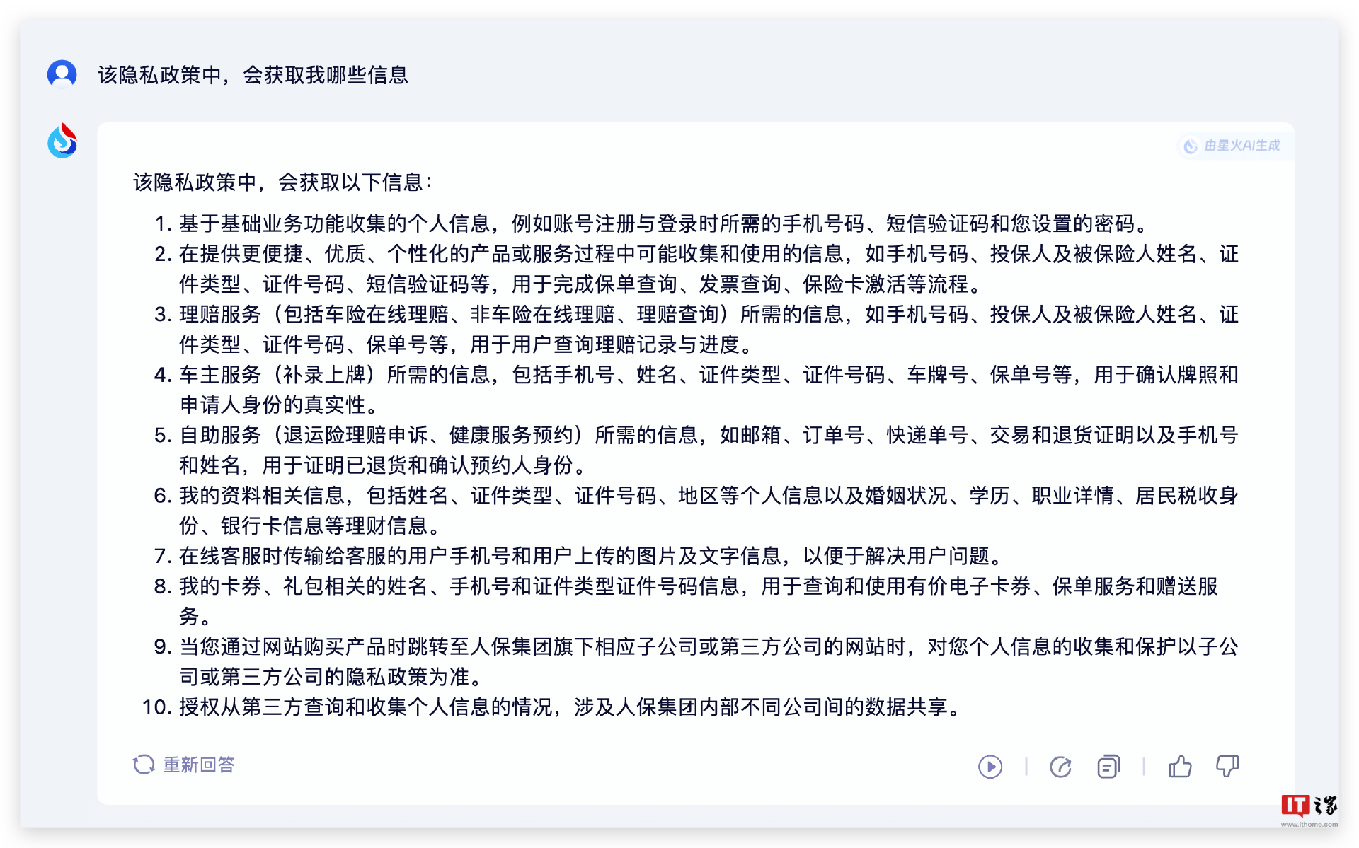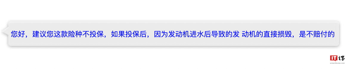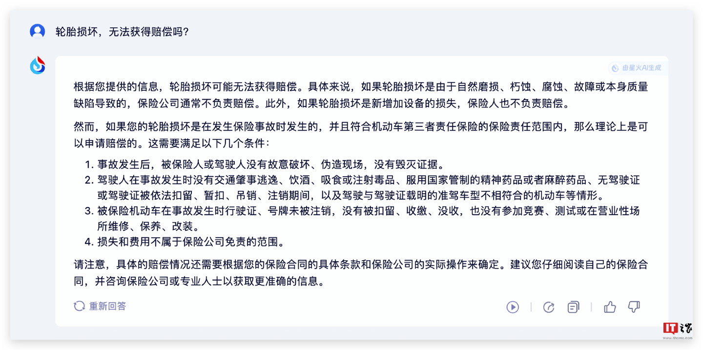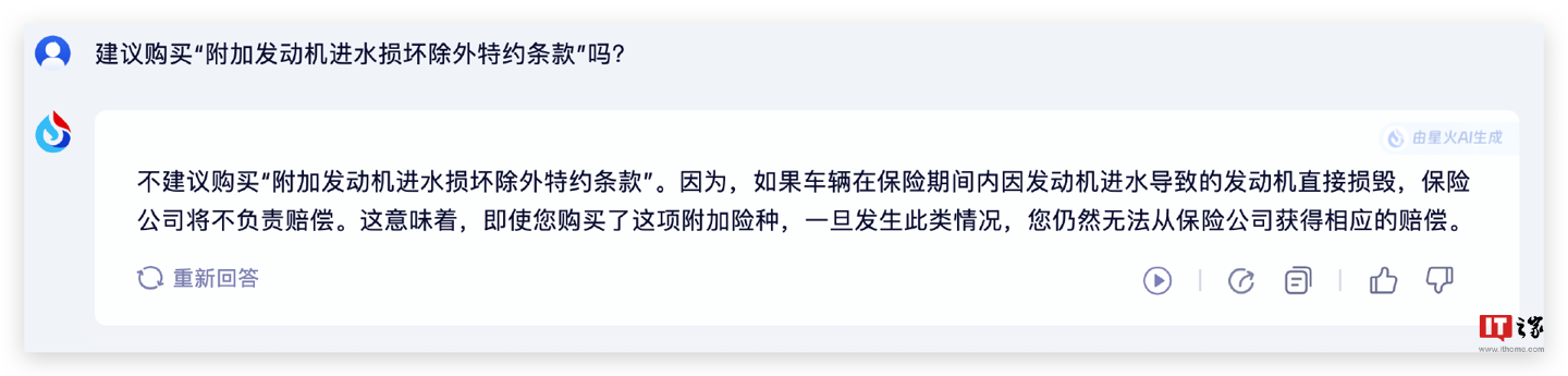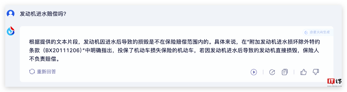 比如,笔者询问“发动机进水赔偿吗?”,讯飞星火大模型 V3.5 迅速给出了回答: