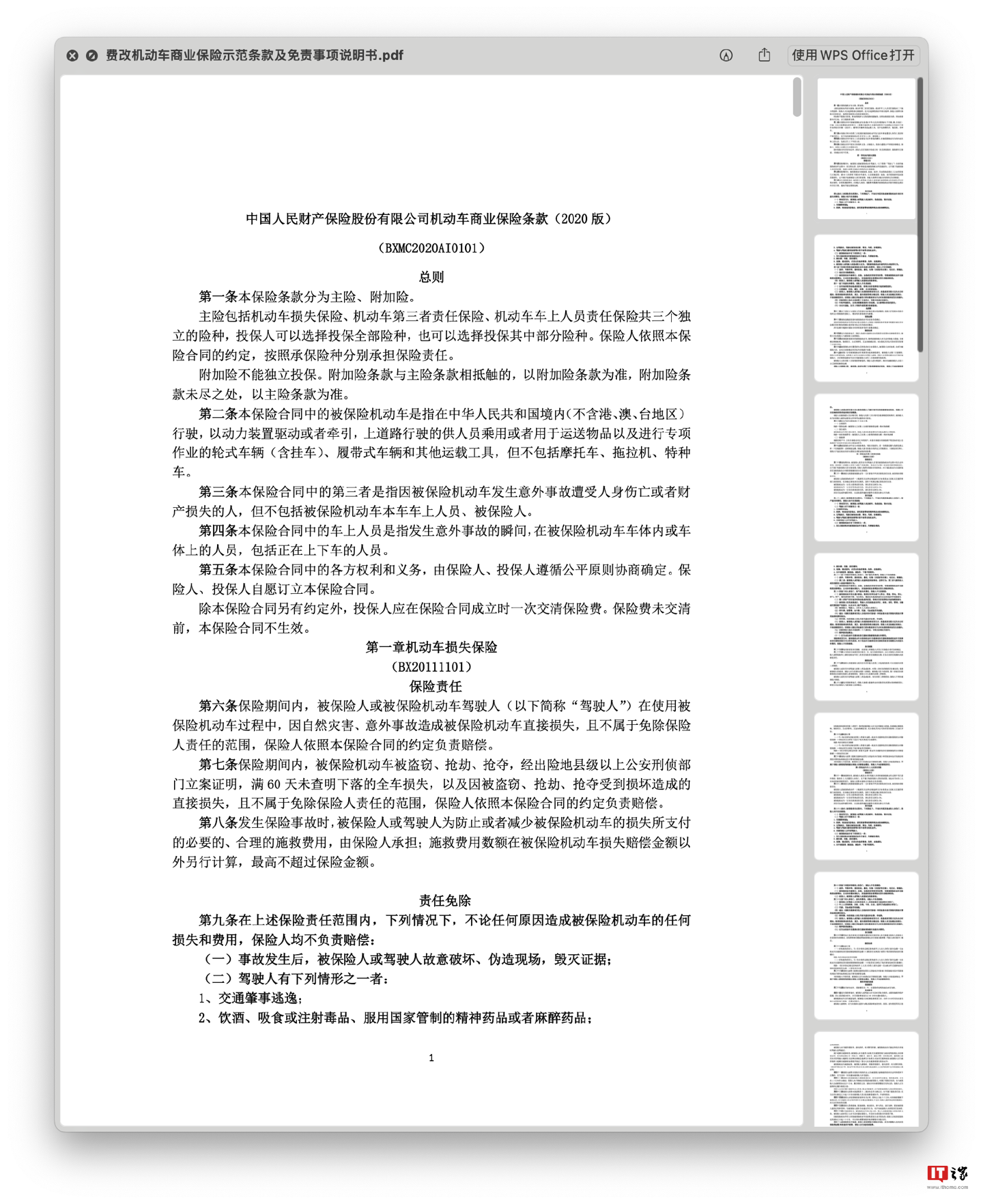 接下来笔者又上传了《费改机动车商业保险示范条款及免责事项说明书》(下图),字数在 2 万 + 左右,并针对免责条款、保险赔偿等方面咨询了各种问题。