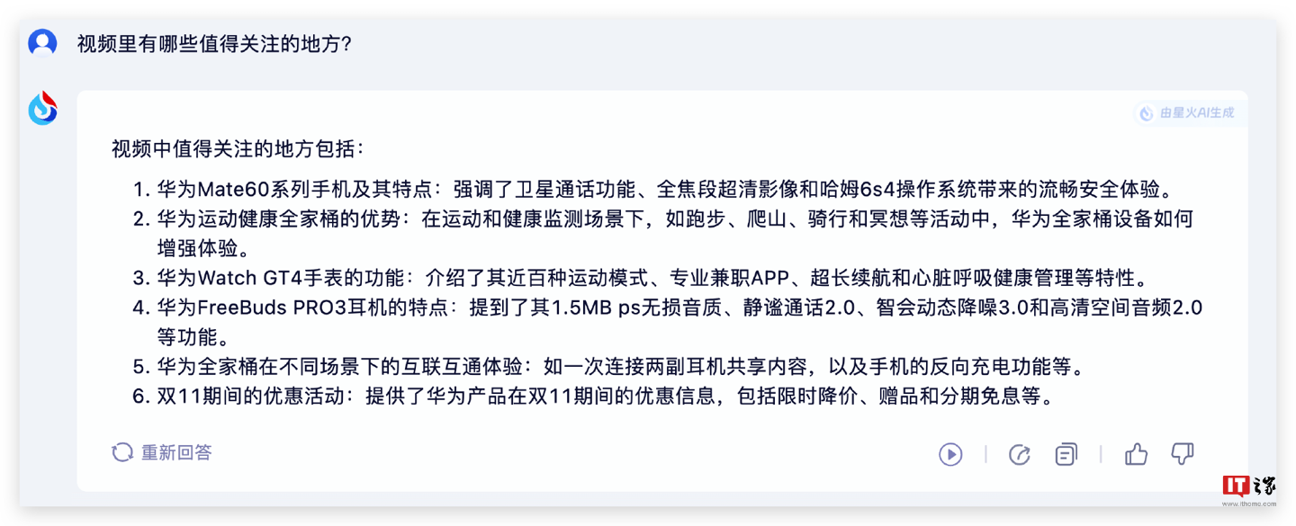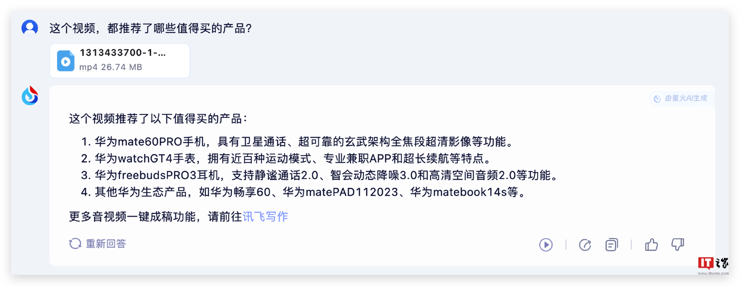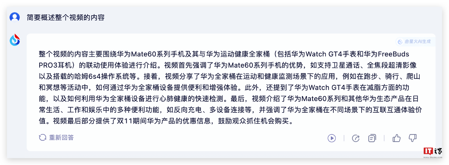 讯飞星火 V3.5 同样也支持上传视频,就拿IT之家发布过的《种草华为运动健康全家桶》导购视频为例,视频长达 6 分钟。