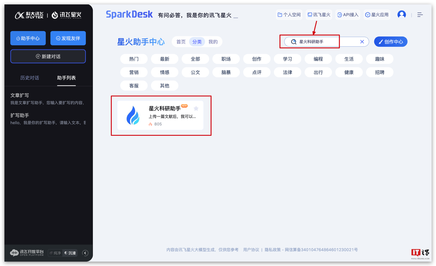 在星火助手中心中,找到星火科研助手,即可进行一系列的专业化回答。