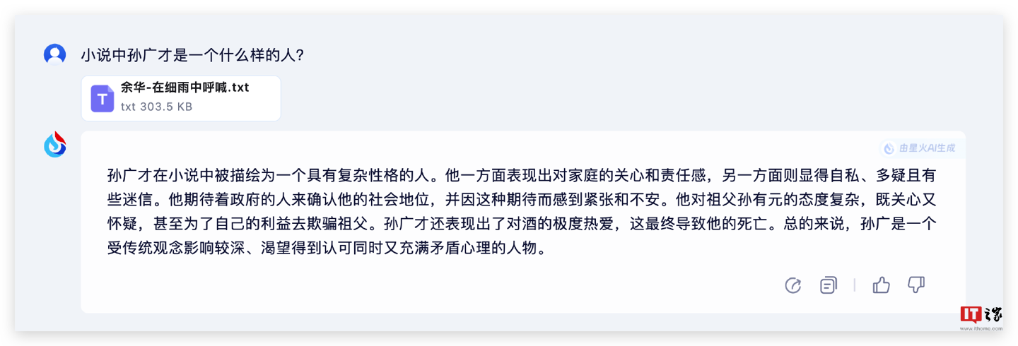 首先笔者提问,小说主人公的父亲(孙广才)是一个怎样的人?讯飞星火 V3.5 的回答如下: