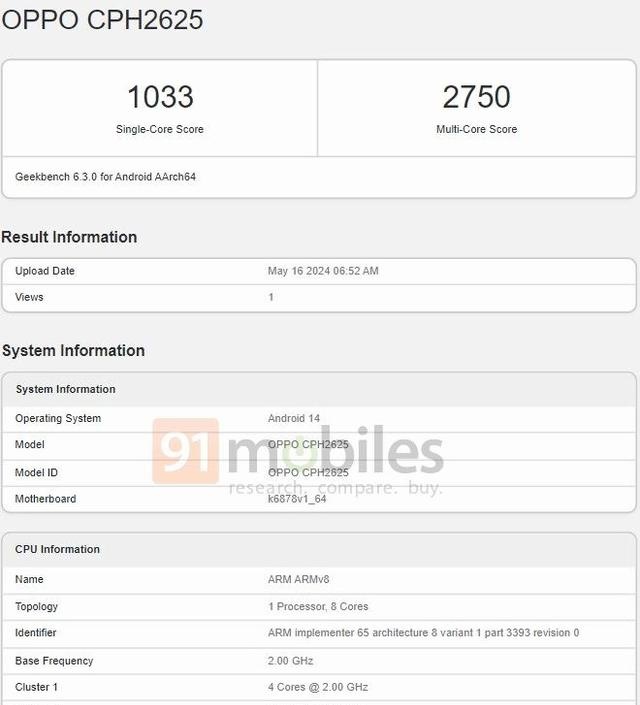根据 GeekBench 跑分库信息,这款手机在 6.3.0 版本中单核分数为 1033 分,多核分数为 2750 分。