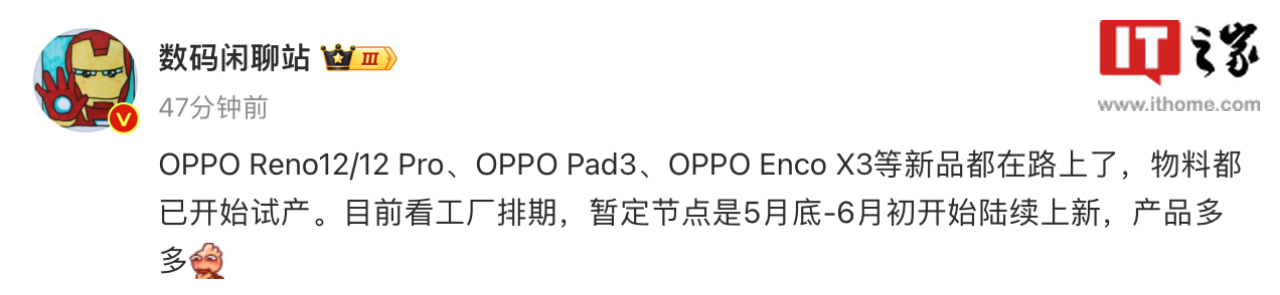 IT之家 4 月 29 日消息,博主 @数码闲聊站 今日发文爆料称,OPPO Reno12/12 Pro、OPPO Pad3、OPPO Enco X3 等新品的物料都已开始试产,暂定为 5 月底至 6 月初开始陆续上新。
