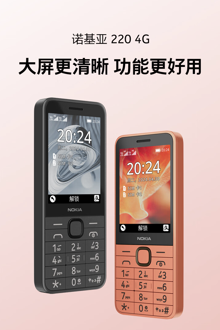 IT之家 4 月 29 日消息,由 HMD Global 制造的诺基亚 220 2024 款 4G 功能机国行版目前已经在京东开售,这款功能机支持 4G 双卡双待 VoLTE,售 299 元。