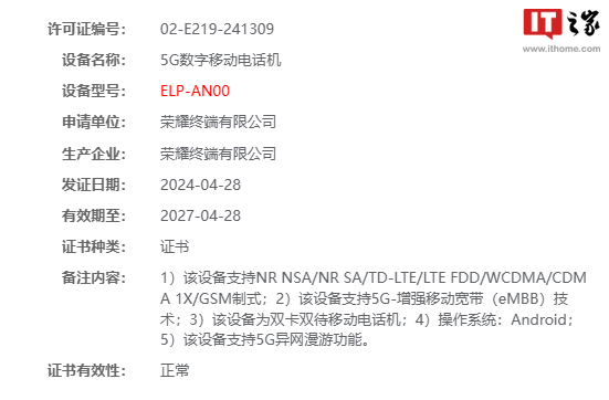 IT之家 5 月 3 日消息,日前,有一款型号为 ELP-AN00 的荣耀新机在工信部完成入网并通过无线电核准,预计为荣耀 200 系列。