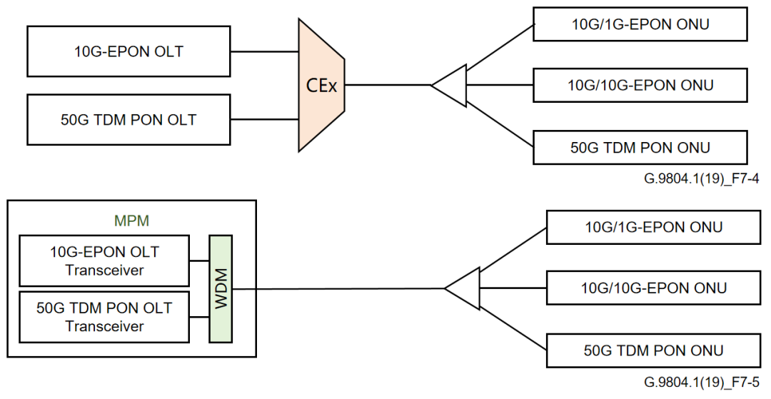 兼容共存的方式分为两种,一种是内置合波(采用 MPM 多模内置合波组件,MPM=Multi PON Model),一种是外置合波(采用独立的 CEx 合波器,CEx=Coexistence)。