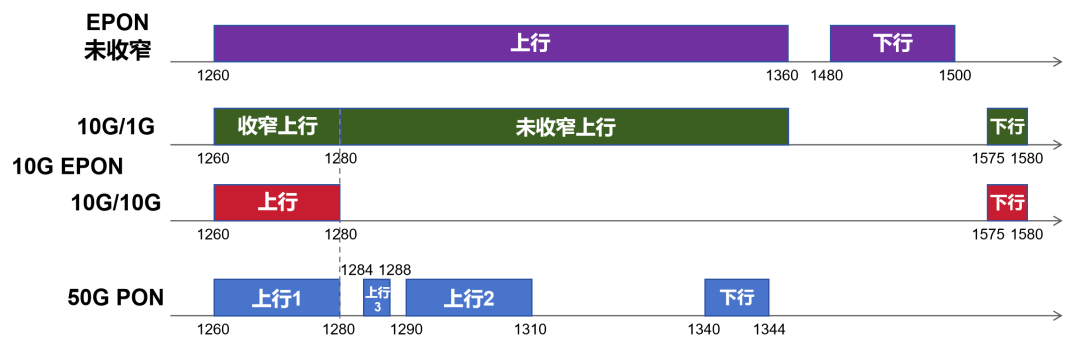 现网的 EPON 存在未收窄(1260~1360nm)和收窄(1290~1330nm)两种上行波长。未收窄的话占用了 100nm,根本没有 50G-PON 的空间,所以只能作罢。