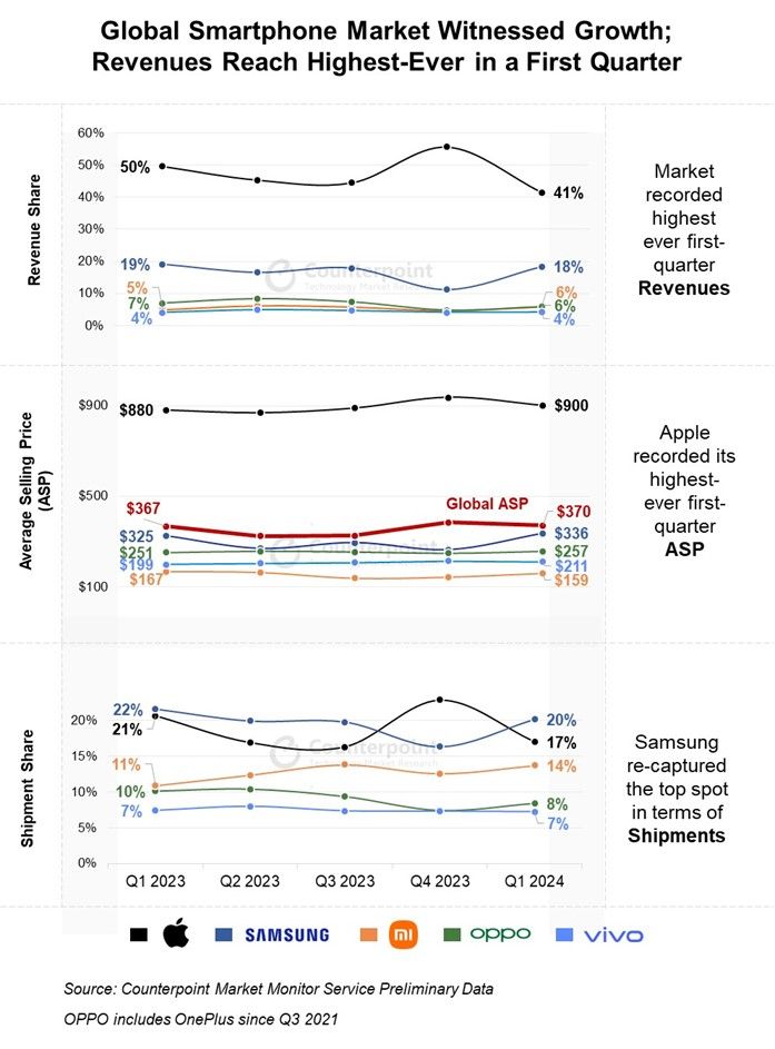 Global Smartphone Market Grows 6% YoY in Q1 2024; Revenue reaches highest level in a first quarter
