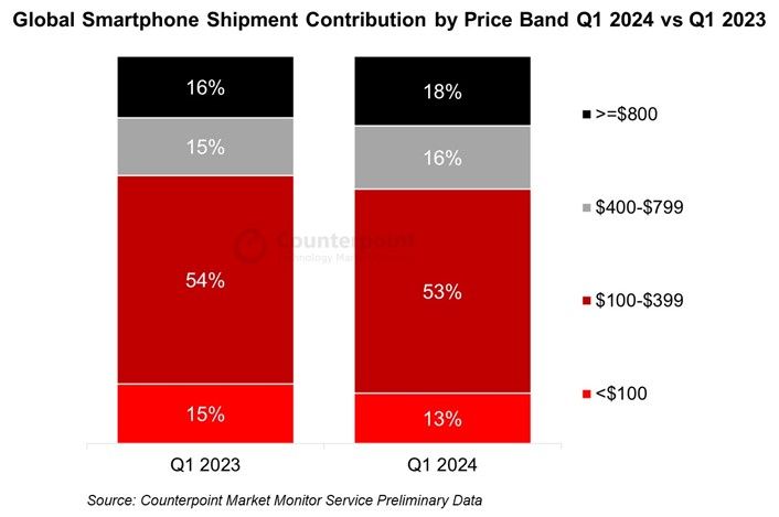 2024 年第一季度,全球智能手机收入同比增长 7%,并在第一季度达到历史最高水平。800 美元以上价格段增长最快,实现两位数增长,占 2024 年第一季度智能手机出货量的 18%,比 2023 年第一季度增长 2 个百分点。