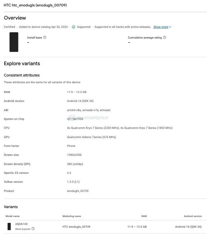IT之家 5 月 4 日消息,HTC U24 Pro 手机近日现身 Google Play Console 数据库,显示手机代号为“enodugls”,配备高通骁龙 7 Gen 3 处理器。
