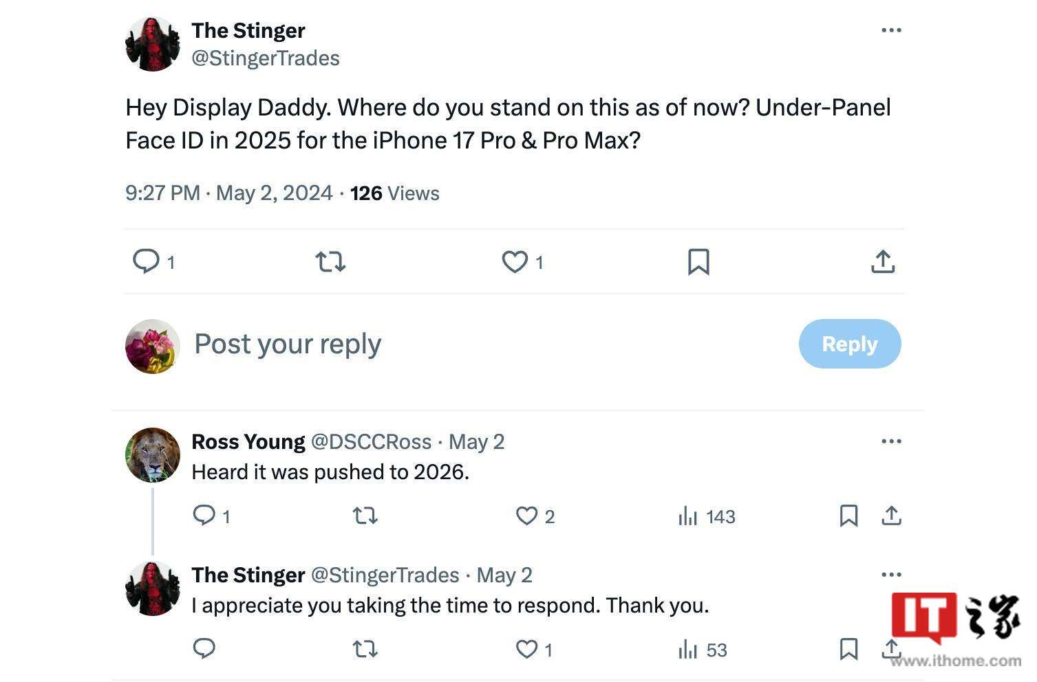 IT之家注意到,业内曾一度普遍认为 iPhone 16 将是首款采用屏下 Face ID 的机型,但如果最新传闻靠谱的话,那么这一可能性将不复存在。显示器分析师 Ross Young 此前曾准确预测过苹果的产品信息,他原先预计 iPhone 17 Pro 和 Pro Max 将是首批采用屏下 Face ID 和打孔式前置摄像头的 iPhone 机型。然而现在他表示,这一计划已经推迟到了 2026 年,也就是说 iPhone 18 Pro 将成为首批采用屏下 Face ID 的 iPhone 机型。