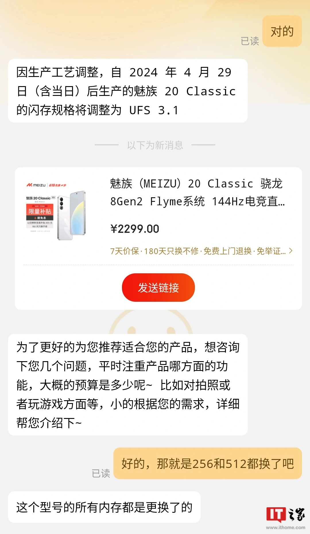 魅族京东自营旗舰店客服表示:“因生产工艺调整,自 2024 年 4 月 29 日(含当日)后生产的魅族 20 Classic 的闪存规格将调整为 UFS 3.1。”