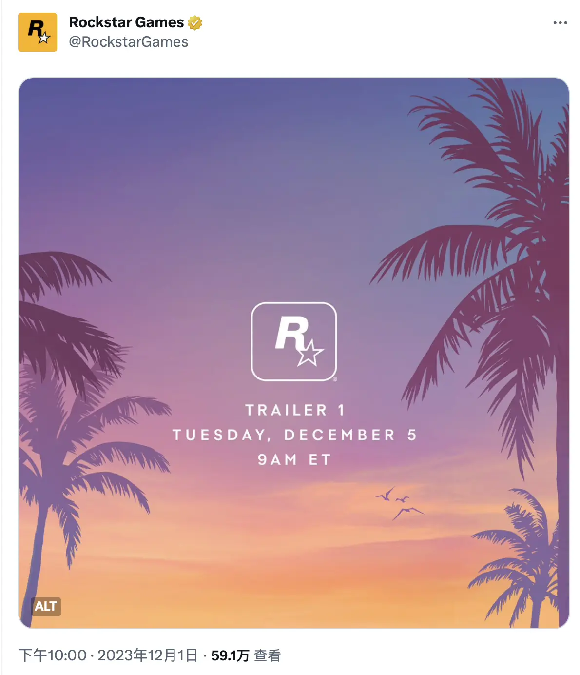 12月1日消息,R星确认,《GTA 6》首部预告片将在北京时间12月5日晚10点发布。