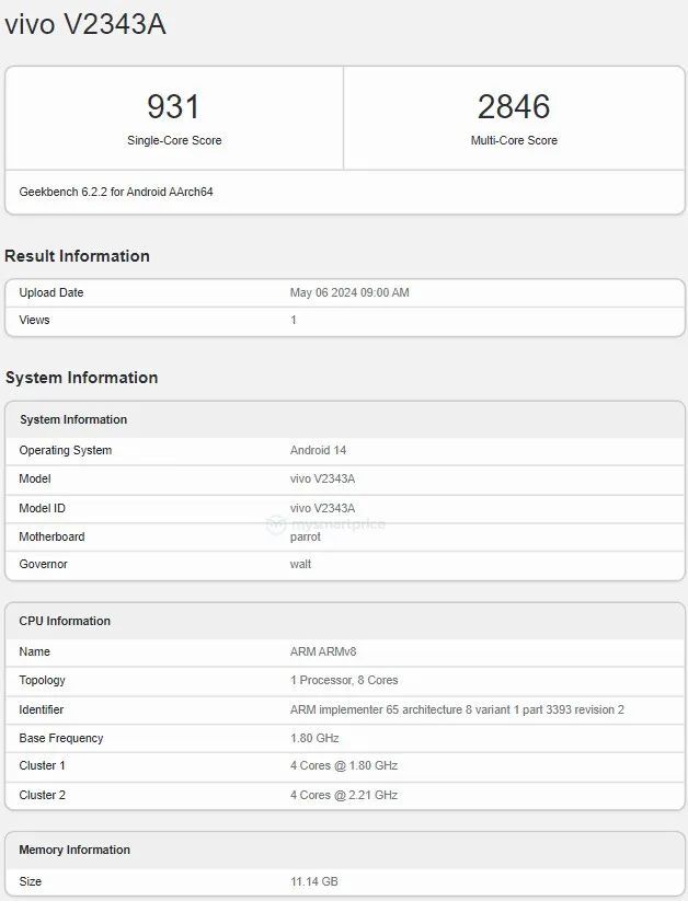 IT之家 5 月 7 日消息,型号为 V2343A 的 vivo 新手机近日现身 GeekBench 跑分库,6.2.2 版本单核成绩为 931 分,多核成绩为 2846 分。