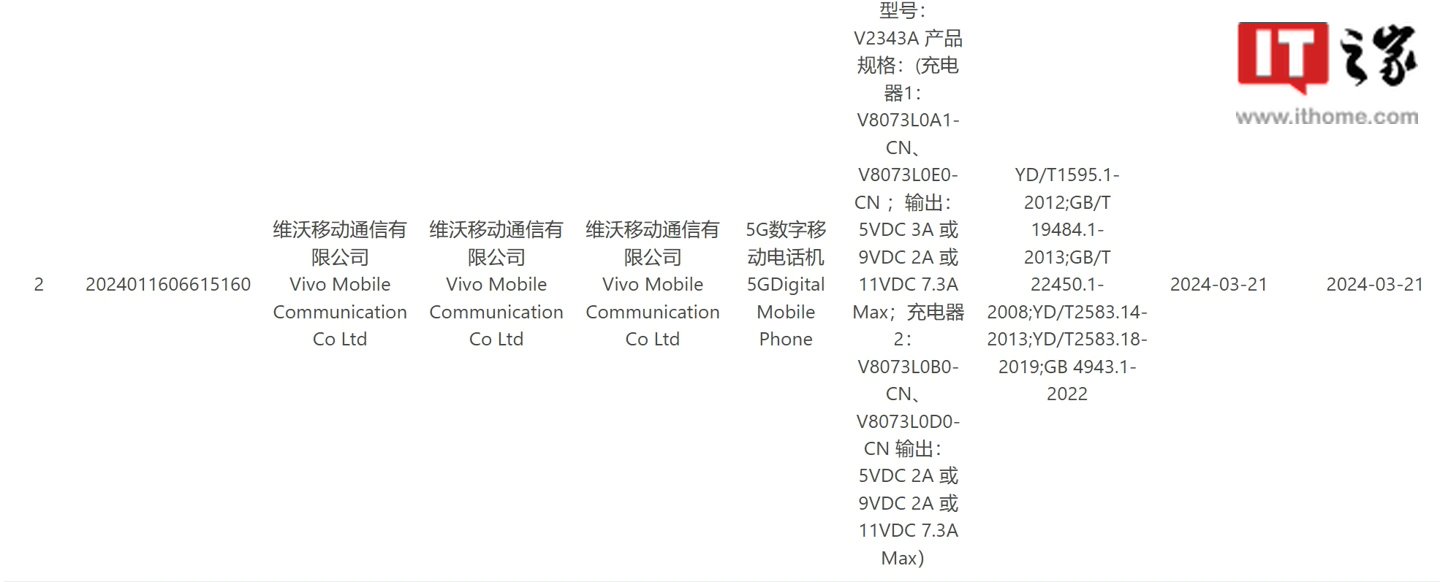 根据 3C 认证页面信息显示,V2343A 手机使用了型号为 V8073L0A1-CN、V8073L0E0-CN、V8073L0B0-CN 和 V8073L0D0-CN 的充电器,这些产品支持 10W(5V / 2A)、15W(5V / 3A)、18W(9V / 2A)和 80W(11V / 7.3A)充电。