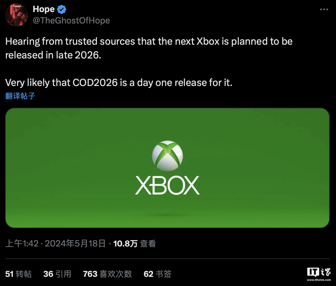 IT之家 5 月 19 日消息,数据挖掘者 The Ghost Of Hope 近日在 X 平台发帖,透露微软计划在 2026 年推出下一代 Xbox 主机,该机将以《使命召唤》作为护航大作。