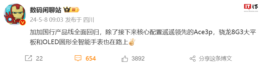 IT之家 5 月 8 日消息,博主 @数码闲聊站 今日发帖称,一加国行产品线全面回归,后续将发布一加 Ace 3 Pro 手机、搭载骁龙 8Gen3 处理器的平板和圆形 OLED 全智能手表。
