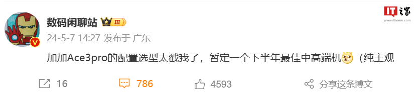 博主 @数码闲聊站 还表示,一加 Ace 3 Pro 手机在核心配置上拥有竞争力,配置选型“很戳”他。