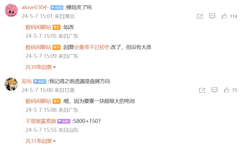 有网友询问相机模组是否有变化,他表示改了,但没有大改;另外,一加 Ace 3 Pro 还将采用曲面屏设计,博主表示是为了塞一块大电池。