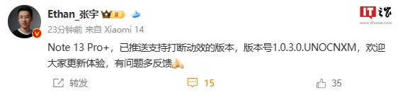 文章来源于互联网:IT之家-小米 Redmi Note 13 Pro + 手机推送 HyperOS 1.0.3.0 版本:新增打断动效