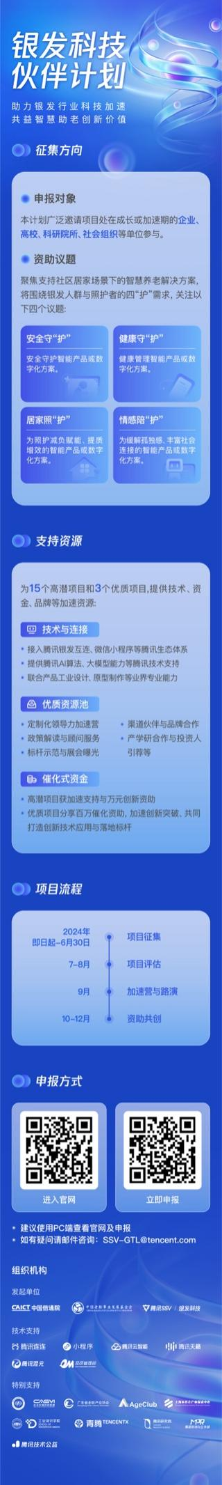 “银发科技伙伴计划”正在广泛邀请项目处在成长、加速期的企业、高校、科研院所、社会组织等单位参与,2024年首期将评选出15个高潜项目、3个优质项目,分享百万催化资金、AI技术和生态资源支持。