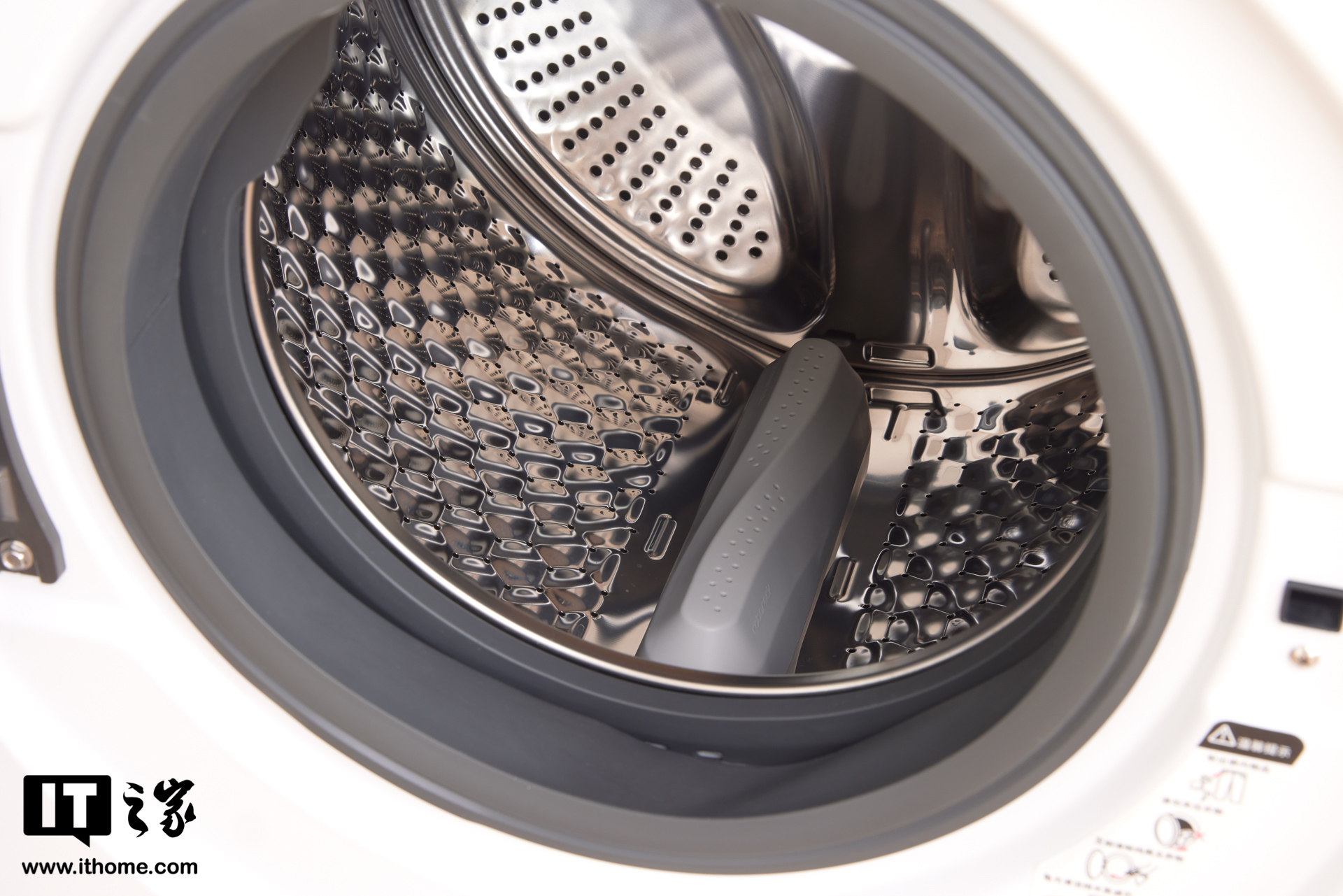 打开滚筒盖,可以看到滚筒内部,内筒直径 510mm,内筒深度 390mm,采用了 DD 直驱变频,1.1 洗净比,最高转速为 1200 转 / 分钟。